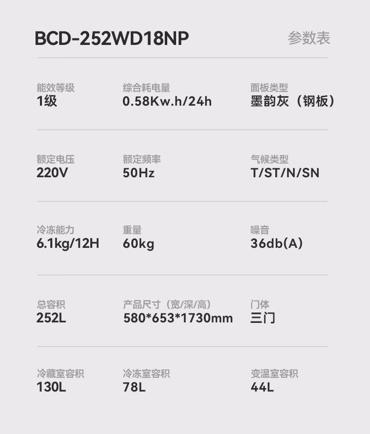 容声冰箱252升双变频三开门一级能效BCD-252WD18NP